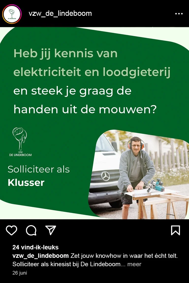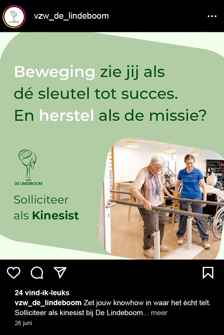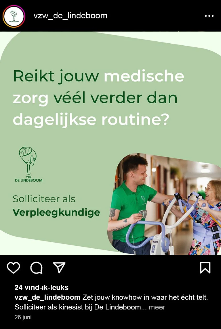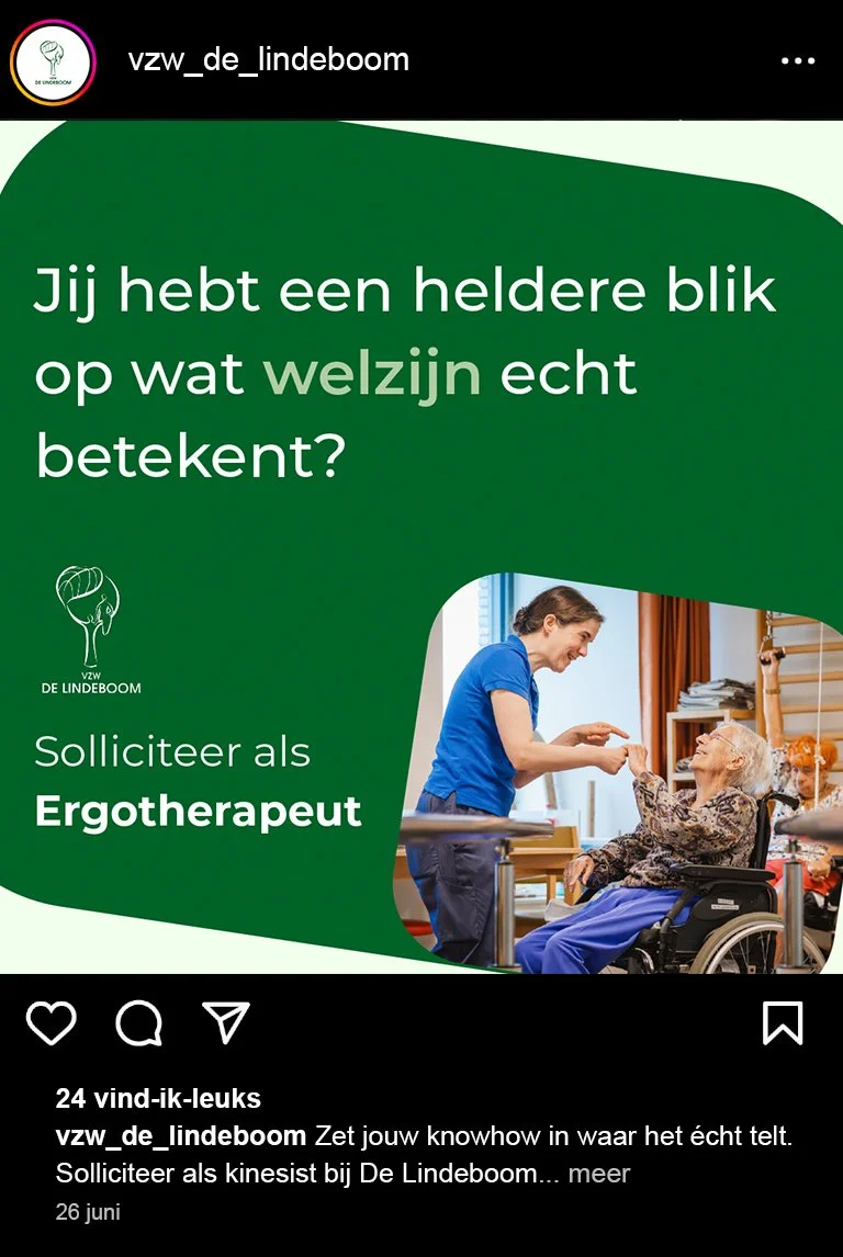 Voor VZW De Lindeboom ontwikkelden we een rekruteringscampagne om vier specifieke profielen aan te trekken: ergotherapeut, kinesist, verpleegkundige en klusser. We verzorgden het volledige traject, van concept en copywriting tot ontwerp en animatie.